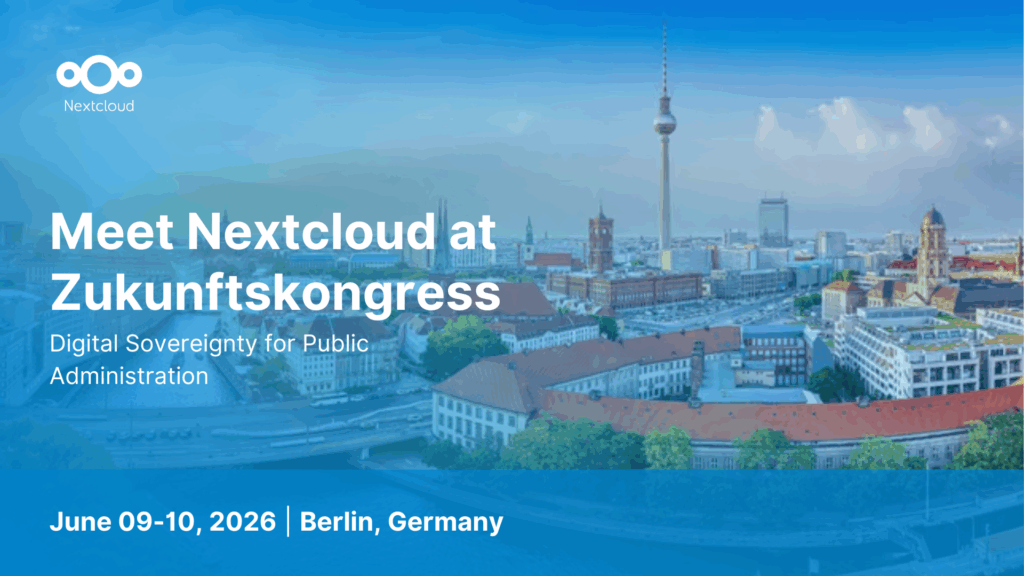 Meet Nextcloud at Zukunftskongress 2026 in Berlin! We’re pleased to announce that Nextcloud will participate in Zukunftskongress Staat & Verwaltung 2026, taking place 9–10 June 2026 in Berlin. As Germany’s leading conference for digital public administration, the Zukunftskongress brings together federal, state, and municipal decision-makers to discuss modernization, secure digital infrastructure, data sovereignty, AI governance, […]