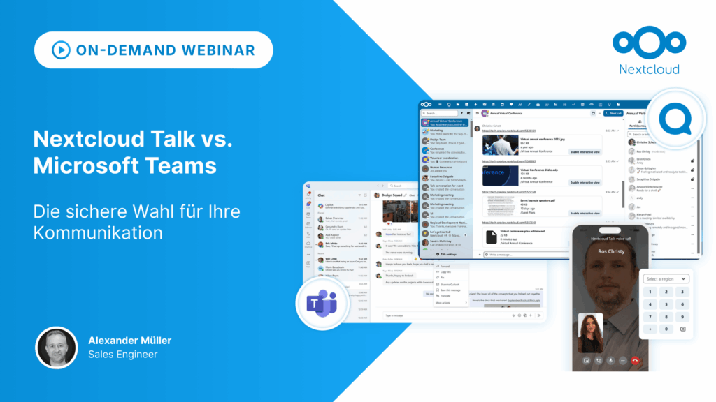 Machen Sie sich unabhängig. Nextcloud Talk bietet digitale Souveränität ohne Lock-in-Effekte und Abhängigkeit von proprietären Anbietern. Die Open-Source-Architektur ermöglicht es Unternehmen, Talk an ihre spezifischen Bedürfnisse anzupassen und in bestehende Systeme zu integrieren.