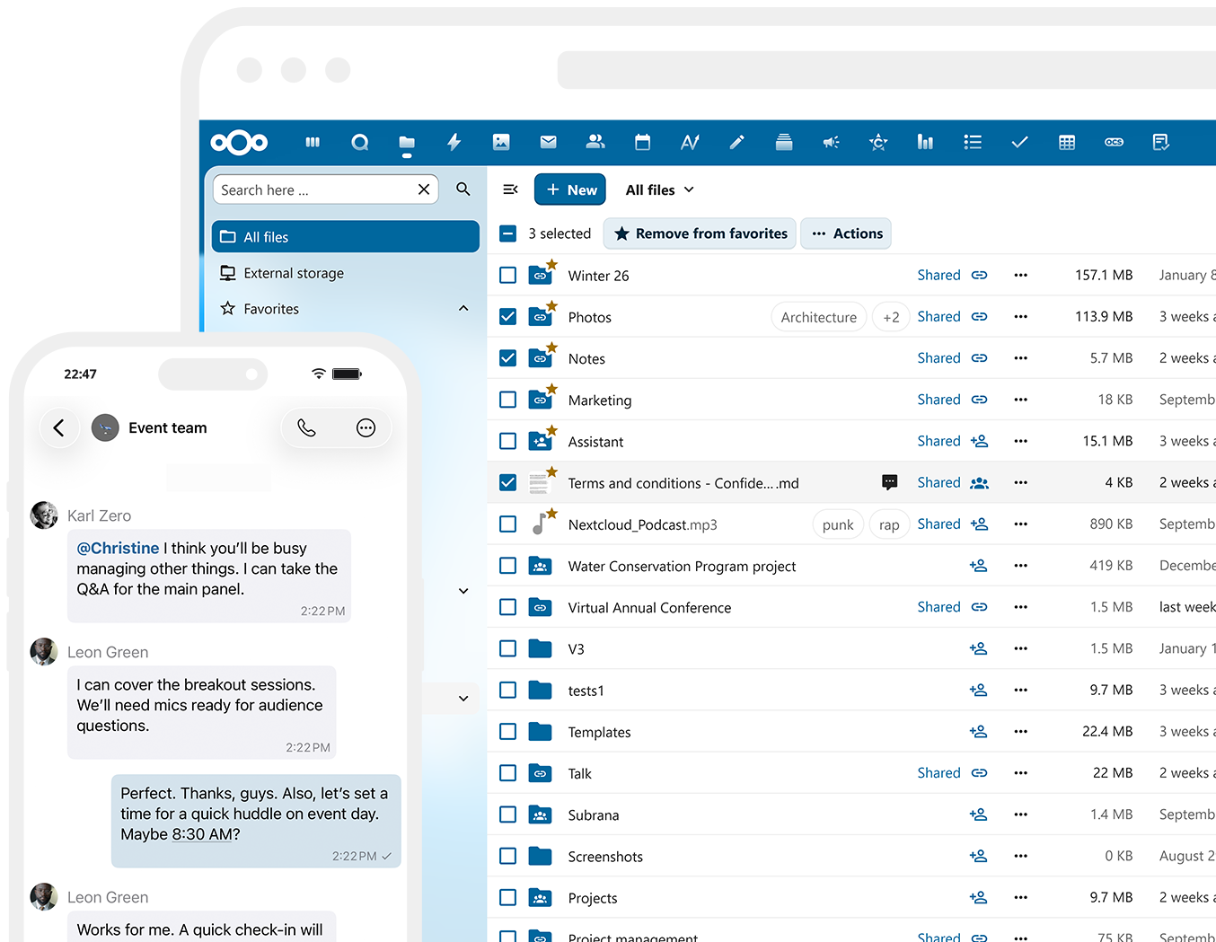 Nextcloud offre une plateforme collaborative de gestion de contenu moderne et facile à utiliser, accessible via des interfaces mobiles, de bureau et web. Les équipes peuvent collaborer en temps réel sur des documents, chatter et participer à des appels vidéo, accéder à leur courrier électronique ou planifier des réunions dans des calendriers. En tant qu’éditeur de logiciels, Nextcloud permet aux hébergeurs de construire leur propre alternative aux services Big Tech tels que 365 ou Workspace.