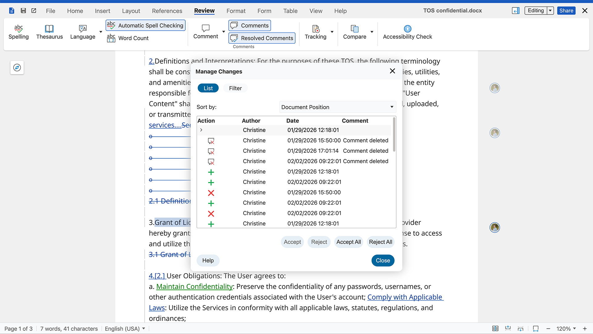 Nextcloud Office usa la modalità Gestione modifiche per mostrare le differenze in un unico file, che puoi esaminare, accettare o rifiutare.