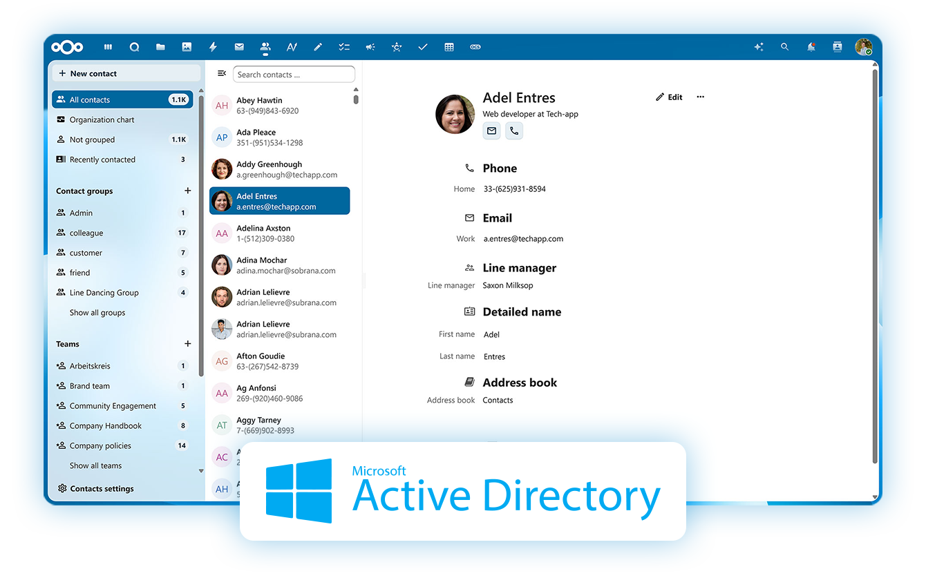 Questa integrazione è particolarmente versatile per quanto riguarda la gestione degli account di Active Directory. Gli amministratori hanno la possibilità di creare, modificare o eliminare in modo efficiente gli utenti nella directory collegata. Nextcloud Hub è dotato di un’infrastruttura di plugin che estende ulteriormente questa funzionalità.